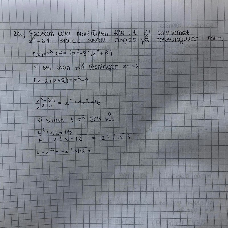 Hej, jag ska bestämma alla nollställen till polynomet . Jag har fått fram två nollställen, z=2 och z=-2, bifogar min uträkning nedan
