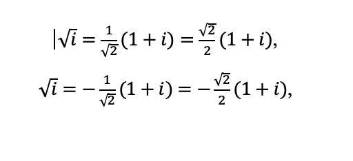 På samma sätt som har två lösningar bland de reella talen så har två bland de komplexa. Men funktioner, som , ska ogärna ge mer än ett resultat, så den behöver ett sätt att välja. Regeln i det reella fallet är "ta den positiva", medan regeln i det komplexa fallet är "ta den vars positiva argument är lägst". Dvs, du står i origo och tittar utmed den positiva reella axeln. Sen vrider du dig åt vänster (moturs sett uppifrån) tills du ser någon av kandidaterna. Den första lösningen till som du ser, det talet är .