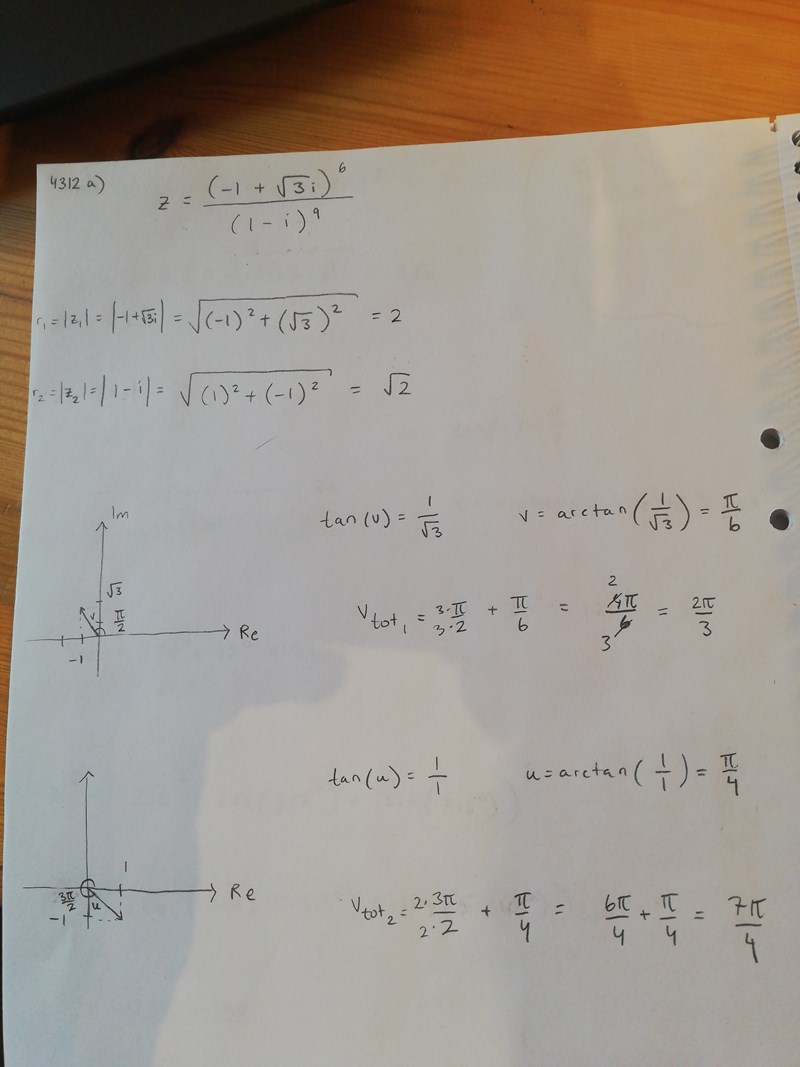 Det som verkar ha blivit fel är din beräkning av argz på slutet, då du använder tan-funktionen. Det fungerar inte i tredje kvadranten, vilket du kan se i din figur. Svaret på uppgiften är ett komplext tal i tredje kadranten i komplexa talplanet, vilket du också ritat in snyggt och prydligt. Men med tangens får du en vinkel som är 1.258rad, vilken ligger i första kvadranten. Och då ser du också att du måste lägga till pi, för att få korrekt vinkel mot positiv reell axel (dvs argz).