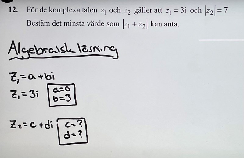 Hej! Jag tittade på en youtube video som handlar om komplexa tal.  Personen i videon förklarade att c som då är den reella delen okänt och d som är den imaginära delen är också okänt. Men jag förstår inte varför c är okänt för z2? Det står ju att absolutbeloppet av z2 är 7. Borde det inte betyda att c=7?