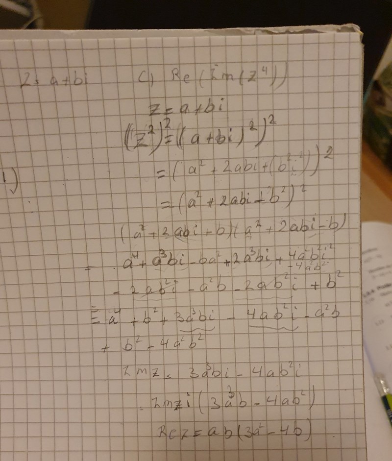 Jag skrev z^4 som ((z^2)^2) och ersättade z=a+bi istället för z ,sedan försökte utveckla pranteserna. Men jag har fått fel svar. Hur ska man tänka här? Hur löser man uppgiften?