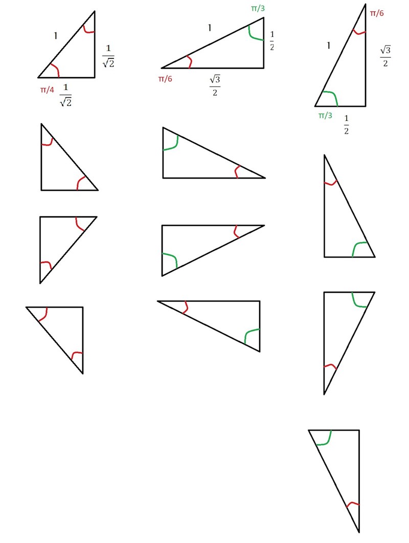 Den tredje triangeln här är den andra fast på hög kant. Sen ser du att jag har roterat dem så det finns 4 varianter av varje, det är för att varje triangel ska kunna placeras i enhetscirkelns kvadranter.