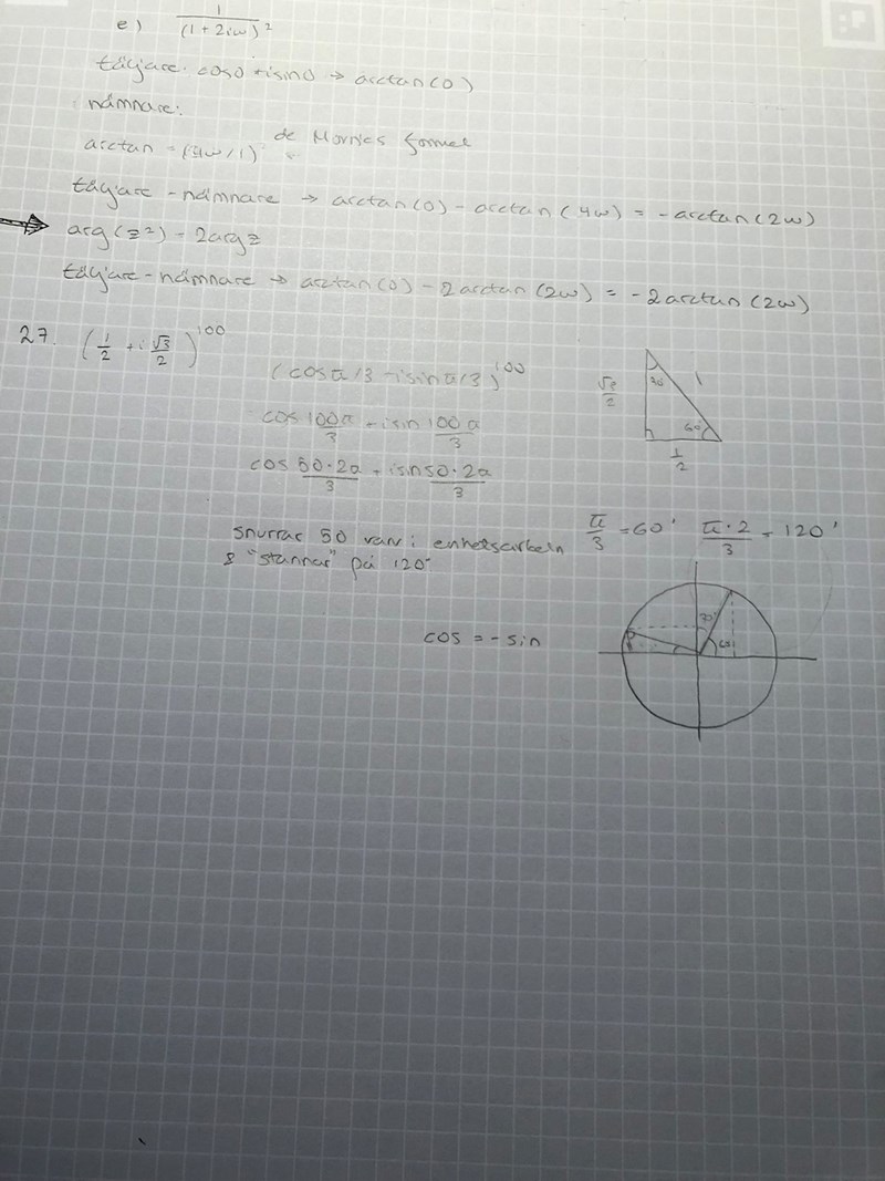 Efter exponentiering med 100 blir argumentet 100pi/3. Från det kan du dra bort ett helt antal varv, dvs multiplar av 2pi, eller vilket är mer praktiskt här, multiplar av 6pi/3