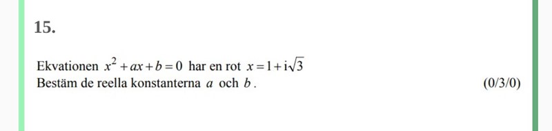 Ja du har missat att det ska blir i innan sqrt(3) så du vill ha sqrt(-3) vilket du får om b=-4 (1-4=-3)