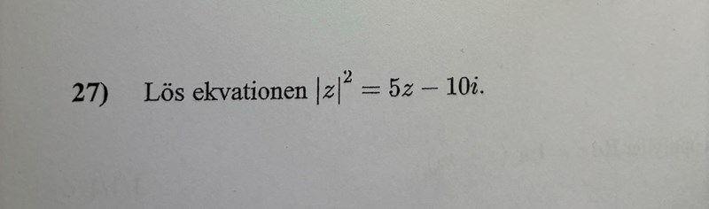 Tänk på att absolutbeloppsfunktionen alltid ger tillbaka ett reellt tal. |z||z| är reellt och då är även |z|2|z|^2 det. Alltså är VL ett reellt tal. Men på HL har termen -10i-10i. Eftersom VL är reell måste även HL vara det. Vilken imaginärdel måste zz ha i så fall?