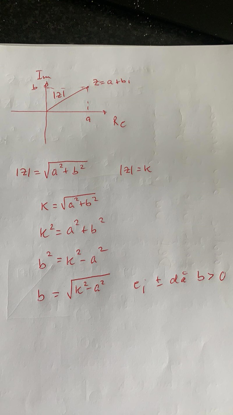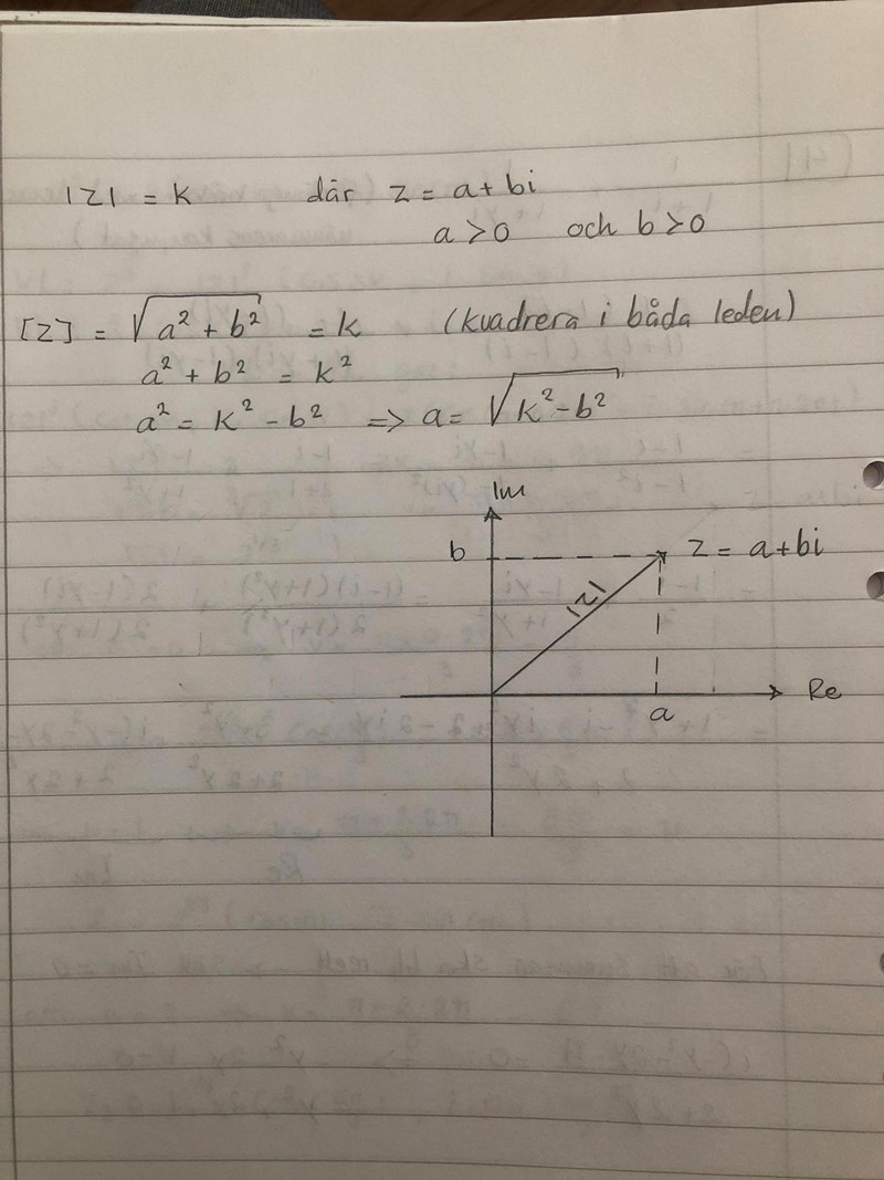 Smaragdalena skrev:Basma1 skrev:Smaragdalena skrev:Jag skulle börja med att rita. Var (i det komplexa talplanet) ligger alla z som har |z| = k och både realdelen och imaginärdelen är positiva? Sedan skulle jag göra som Smutstvätt föreslår.