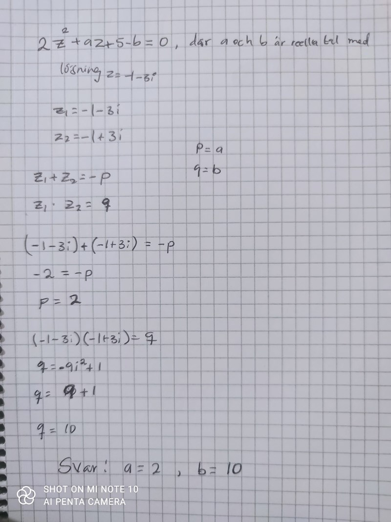 Behöver hjälp med att lösa 2z^2+az+5-b=0 där a och b är reella tal har en lösning z = -1-3i, Jag ska bestäma konstanterna a och b. Kommer in vart, har bara försökt pq formeln.