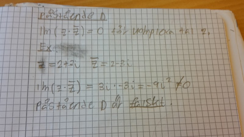 Således blir Im(z*(z med streck ovanpå)) = 4 + 9 = 13 vilket inte är lika med 0 och D är fortsatt falsk.