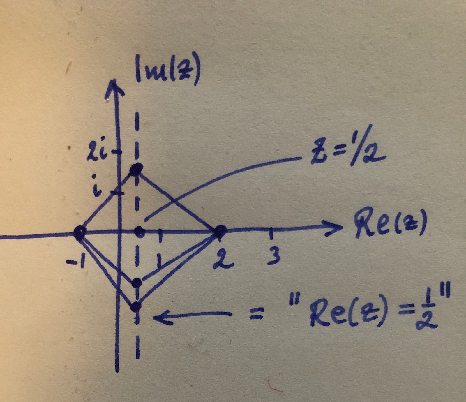Se om du förstår denna grova skiss. Alla punkter på den lodräta linjen Re(z)=1/2 har lika långt till -1 som till 2.