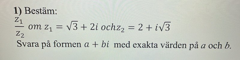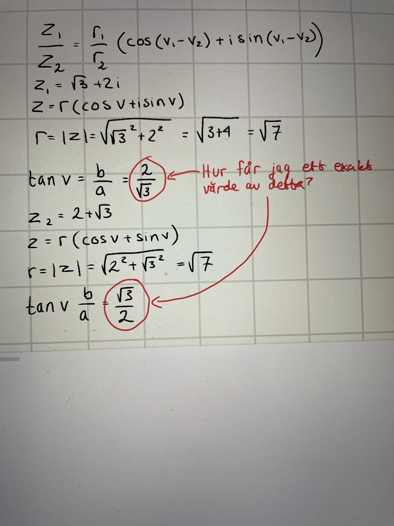 För att lösa den så antar jag att jag ska gå enligt formeln nedan som står längst upp. Jag måste då skriva om z1 och z2 i polär form. Jag lyckas ta reda på r och sedan v men v blir ju inte ett exakt värde (det blir inte r heller men i slutändan blir det (roten ur 7)/(roten ur 7) vilket blir 1, så det gör ingenting. Hur kan jag få ett exakt värde av tangens v för värdena nedan? Jag hittar inget exakt värde i min värdetabell, och har letat runt efter hur jag kan tänkas gå tillväga men hittar ingenting.
