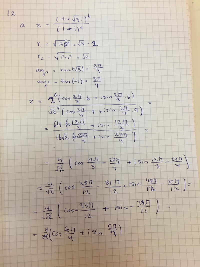 sen räknar jag ut argumentet som blir tan(-roten ur 3)=(2pi/3*6)-(3pi/4*9)=12pi/3-27pi/4=-11pi/4= 5pi/4