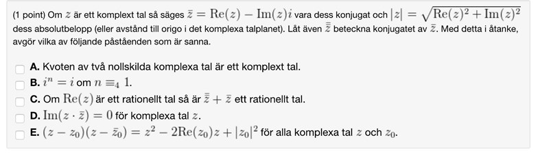 Välkommen till Pluggakuten! Det komplexa talet a+bi har konjugatet a-bi. Beloppet av talet är a2+b2. Beloppet motsvarar längden av talet om det ritas in som en vektor i ett koordinatsystem. Nu har du fått fem påståenden, vars sanningshalt du ska avgöra. Börja med det första: Kvoten av två nollskilda komplexa tal är ett komplext tal. För att bevisa att ett påstående inte är sant behöver du endast visa upp ett fall som påståendet inte stämmer för. Kan du komma på något sådant fall?