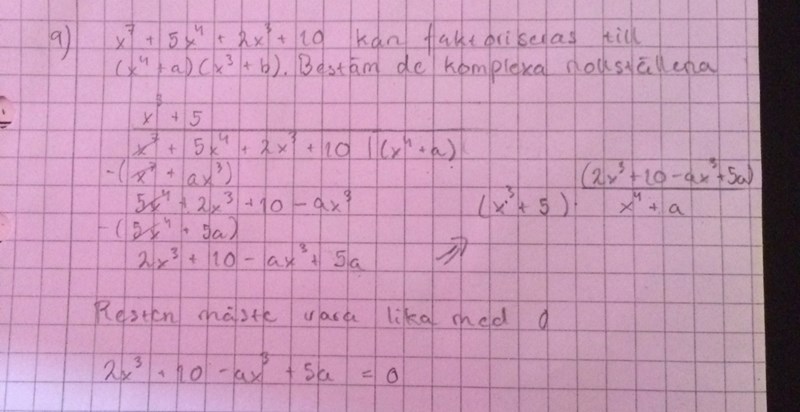 Som jag förstår det ska man utföra långdivision och sedan likställa resten med 0, men jag förstår inte hur jag ska komma vidare. Har jag gjort fel någonstans?