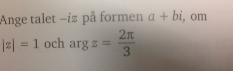 Eget resonemang: Jag ser framför mig en cirkel på ett komplext talkplan med radien 1. Arg Z motsvarar en vinkel i denna cirkel på 120 grader. Detta gör att jag vill skriva svaret -1/2 - (roten ur 3)/2*i. Som ni ser väljer jag här sinx till den imaginära axeln. Men i facit verkar dem välja cosx till den imaginära axeln och svarar typ tvärtom mitt svar: (roten ur 3)/2 + 1/2*i.