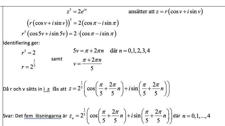 Men eftersom z5=(reiv)5=r5e5ivz^5=(re^{iv})^5=r^5e^{5iv} så måste det gälla att r5=2r^5=2