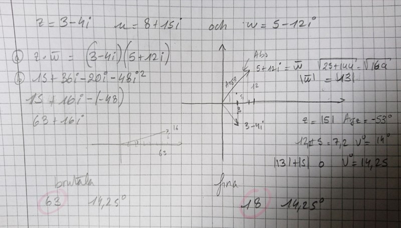 z = 3 - 4i, u= 8 + 15i och w = 5 - 12i