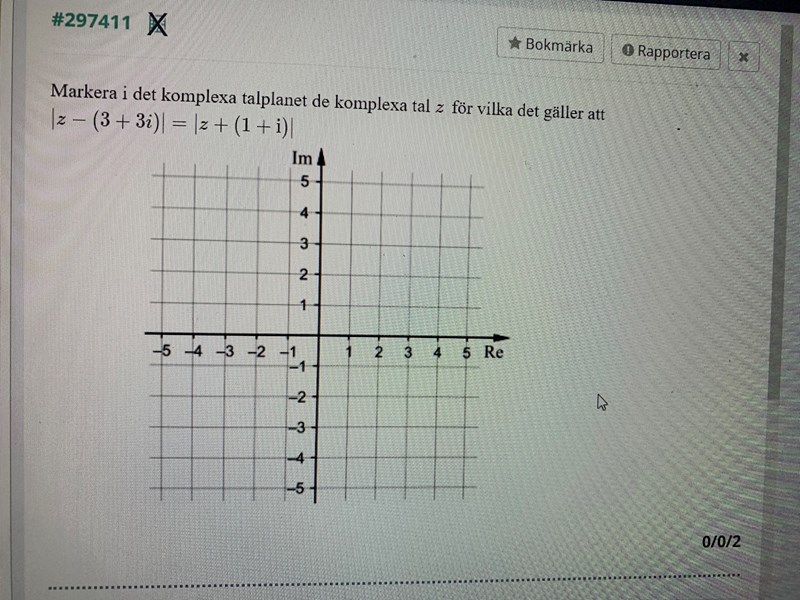 Det står att du skall markera något i komplexa talplanet. Det betyder att du skall rita. Börja med att markera de båda aktuella talen i komplexa talplanet. Lägg upp bilden här.