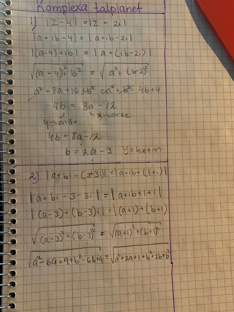 Smaragdalena skrev:Det står att du skall markera något i komplexa talplanet. Det betyder att du skall rita. Börja med att markera de båda aktuella talen i komplexa talplanet. Lägg upp bilden här.