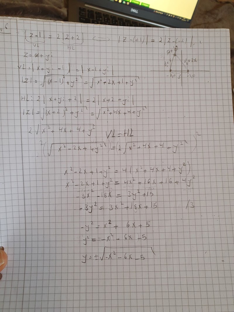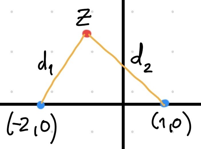 Om jag har förstått rätt så säger absolutbeloppen, att avståndet mellan ett komplex tal , alltså z till mittpunkten 1 ska vara dubell så stor som avståndet mellan komplexa tallet och mittpunkten-2. Stämmer det??