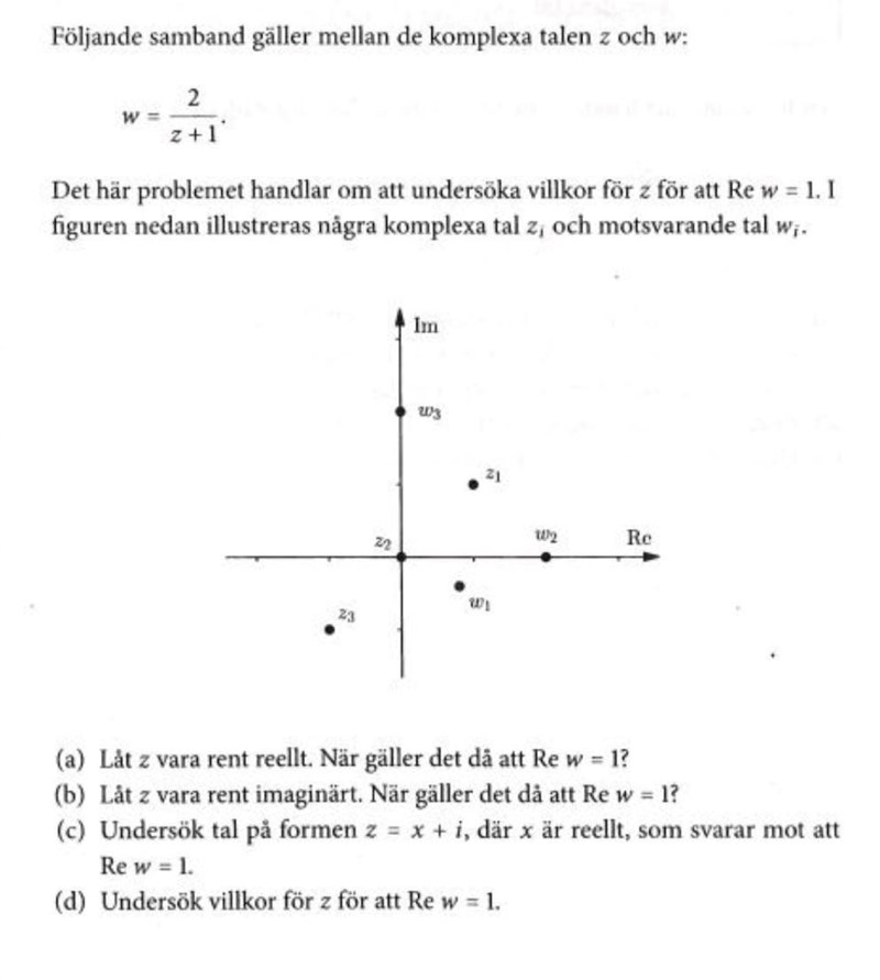 Jag har inte kunnat lösa hela a) och b) uppgiften, samt har fastnat på d) uppgiften. På a) har jag kommit så långt att z är rent reellt när ex z = 2+i0 och om z är reellt är w reellt, alltså w = Re w = 1.