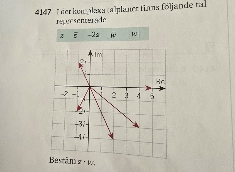 De enda pilar som passar in på detta är de två till vänster. Alltså är z=-1+2iz=-1+2i och z¯=-1-2i\bar{z}=-1-2i eller vice versa.