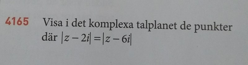 Menar du att z kan skrivas a+ bi dvs x+iy och då kan ju |z-2i| skrivas som|( a+bi)- (0+bi)| eller menar du att |z-2i|=|z-6i| kan skrivas som |(a+bi)- 2i| = |(a+bi)- 6i|