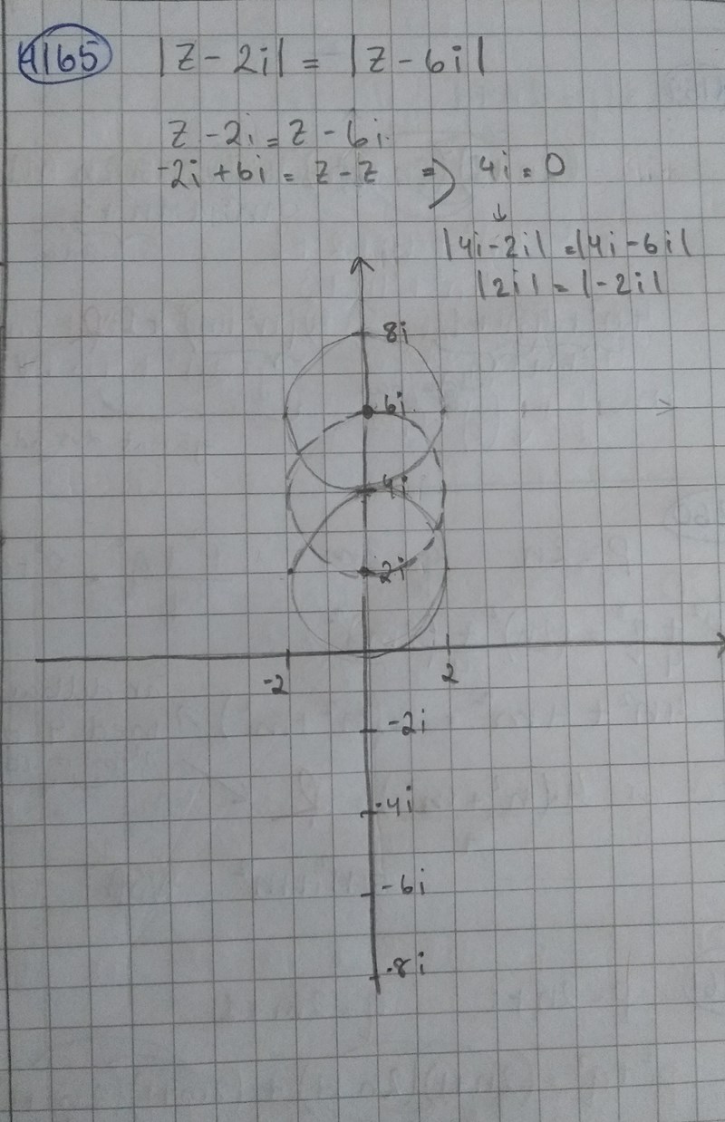 Rita det komplexa talplanet, markera punkterna 2i och 6i. Försök nu att hitta alla de punkter som ligger lika långt från dessa två punkter.