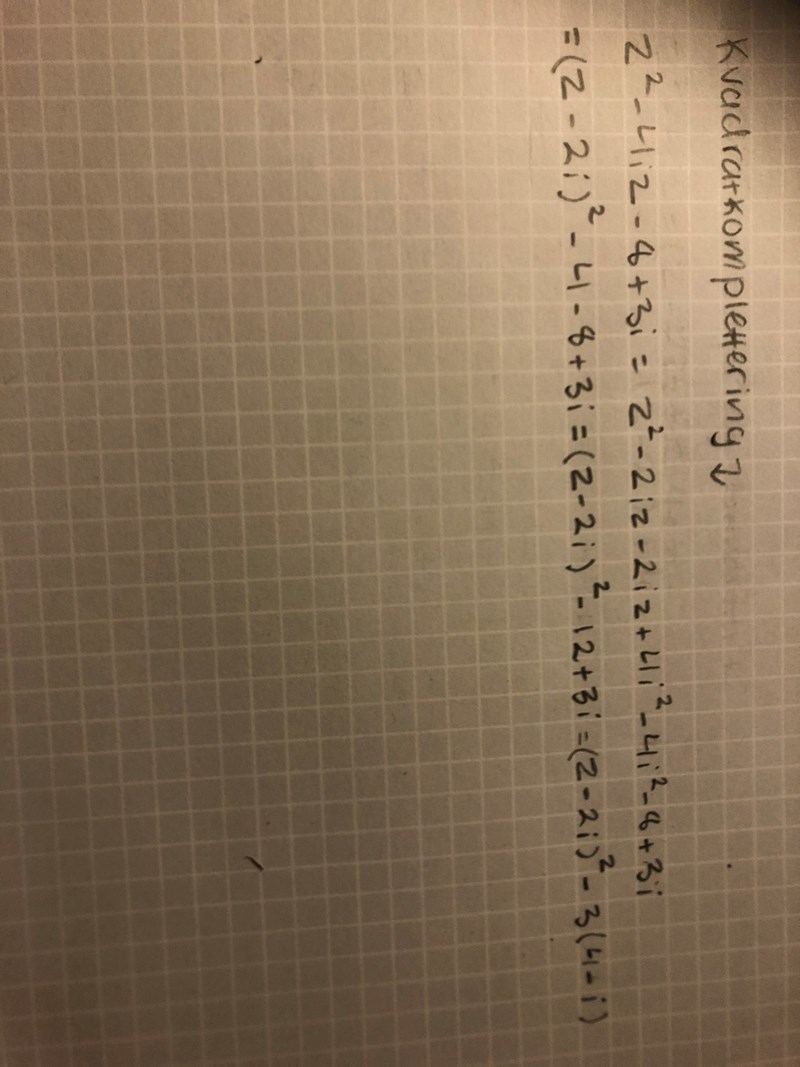 Tack, Jag har kontrollerat och det ska vara -4 istället för +4. Då har jag kommit fram till (z-2i)2 +4-8+3i=(z-2i)2 -4+3i