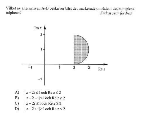 Svaret är B. Jag förstår att realdelen måste vara större (eller lika med) 2. Men jag förstår inte riktigt absolutbeloppet, den ska vara större (eller lika med) 1 och det framgår i figuren att radien är 1 (jag utgår från att cirkelns mitt är "origo") men jag förstår inte riktigt (z-2-i).