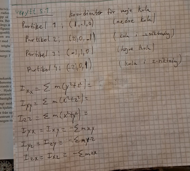 Jag undrar hur man ska räkna de här tröghetsmomenten framför allt Ixx , Iyy och Izz mha de här koordinaterna jag tog fram för varje partikel i figuren?
