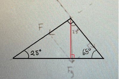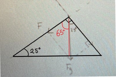 I den stora triangeln vet vi att det är 25 grader till vänster och 90 grader högst upp. Då måste vinkeln nere till höger vara 65 grader (25+90+65 =180).