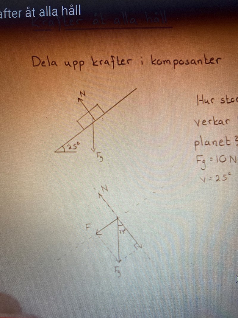 Och ja, det är bra rita en figur med krafter och vinklar utsatta (och trianglar där det behövs). Det tjänar du på i längden.