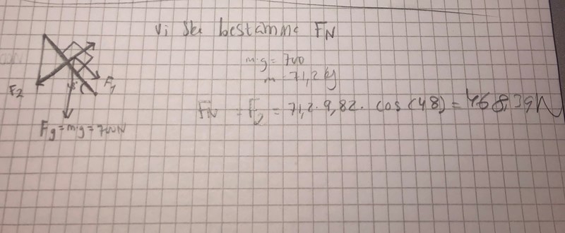 Oskar åker nedför en backe som har en lutning på 48 grader. Tyngdkraften som verkar på Oskar är 700 N. Bestäm storleken av den komposant av tyngdkraften som är vinkelrät mot backen.