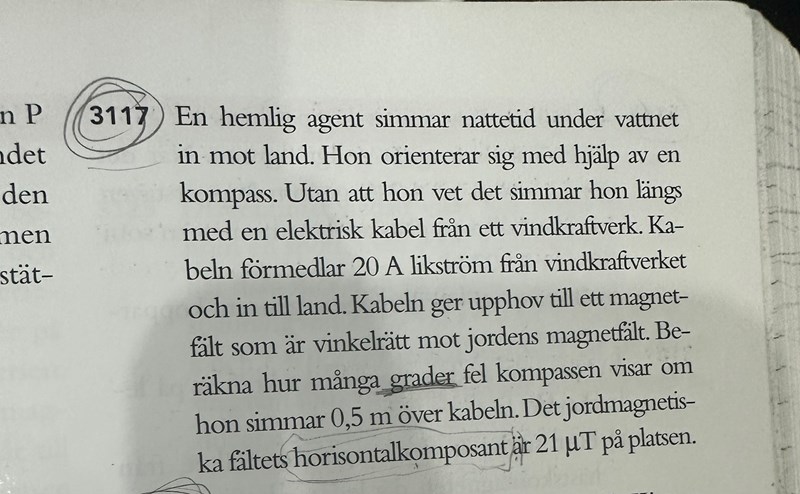 I uppgiften står det att kabeln ger upphov till ett magnetfält som är vinkelrätt mot jordens magnetfält? Hur ska man rita det? Använde man kanske bara den horisontella komposanten?