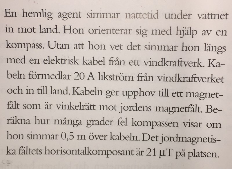 Jag förstår denna uppgift förutom i en punkt. I uppgiften säger de att magnetfältet från ledaren och det jordiska magnetfältet är vinkelräta i förhållande till varandra, så varför är det magnetfältet från kabeln och horisontalkomposanten som är vinkelräta mot varandra enligt figuren?