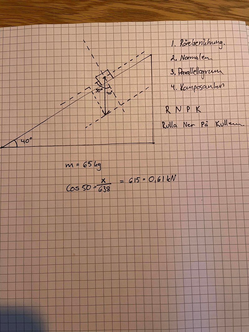 Här påstår du att cos(50o) = 0,61 kN. Det är helt enkelt inte sant. Missbruk av likhetstecken är ett allvarligt fel som brukar ge kraftigt poängavdrag på prov.