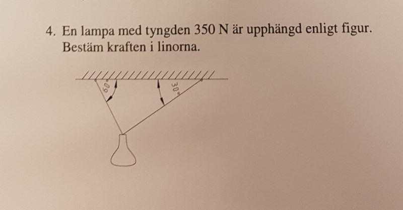 Till att börja med kan du rita en motkomposant till rakt upp. Lämpligen 35 mm lång. Sen ritar du linorna till taket med rätt vinklar. Gör de så långa så du hamnar ovanför den 35 mm långa linje du ritade rakt upp. Sen ritar du in och i en vektoraddition med 350 N som resultant.
