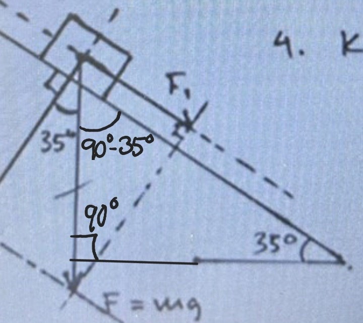 Den stora triangelns vinkelsumma är 180°, därför är den övre vinkeln i den 90°-35°, se bild.