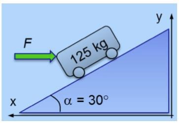 B) Man trycker med en horisontell kraft F = 708.7 N p ̊a en vagn med massan 125 kg, s ̊a att den h ̊alls stilla p ̊a ett lutande plan enligt figuren. Planet lutar vinkeln α = 30◦ mot horisontalplanet.
