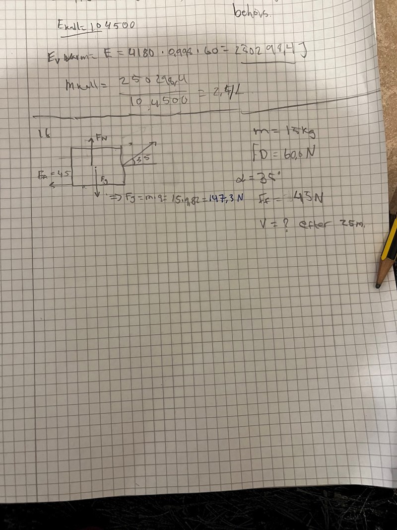 Jag gissar: Om dragkraften på 60N utövas i en 35o lutning, och friktionskraften är 45N, hur stor blir hastigheten efter 25 meters acceleration?