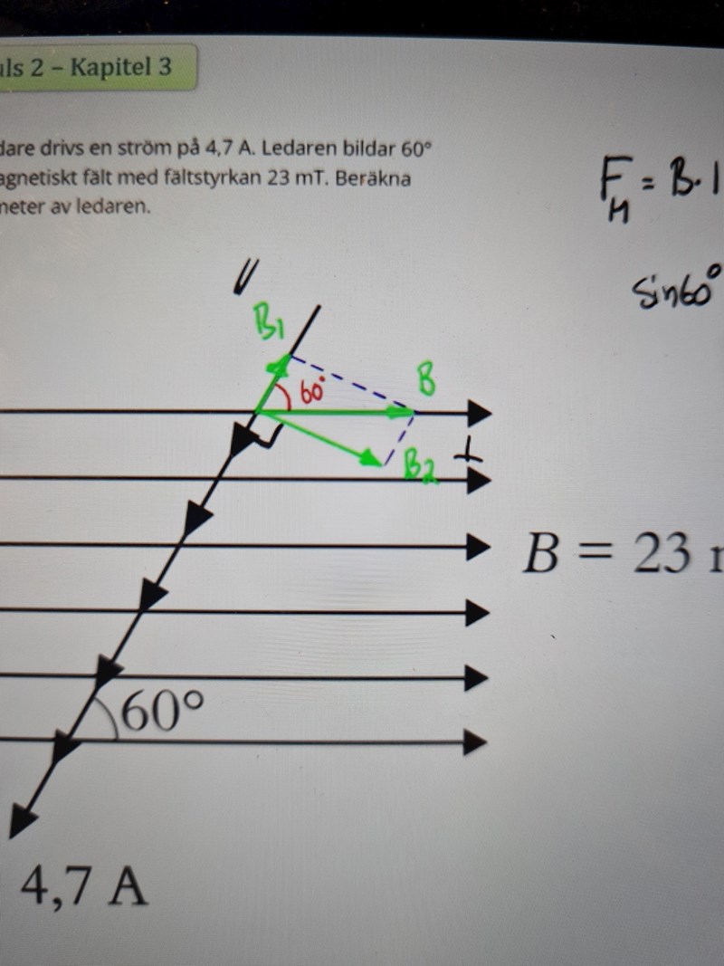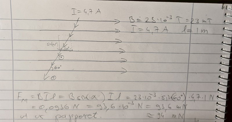 Och i det här exemplet, när man komposantuppdelar strömmen, så räknar man med den ursprungliga strömmen gånger sinus för vinkeln mot magnetfältet, eller hur? Fick i alla fall samma svar för båda fall av komposantuppdelning.