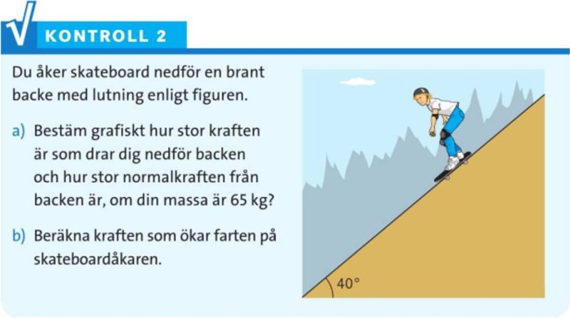 a) Kraften som drar mig nedför backen är väl den som pekar nedåt längs med backen? Alltså 0,41 kN? Men normalkraften är 0,49 kN. Har jag missuppfattat när jag menar att det är kraften F1 som drar mig nedför backen? Tycker frågan är konstigt ställd som frågar efter både kraften som drar ned mig SAMT efter normalkraften, som om de har samma värde?