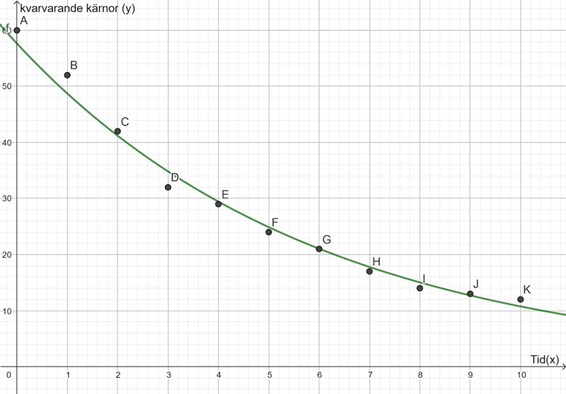 Jag får sedan ut en funktion som ser ut som följande: . Vad jag har förstått i frågan ska vi med hjälp av funktionen samt grafen räkna ut vad halveringstiden blir. Det jag kan anta är att x kommer vara tiden i detta samband. När jag då använder mig av f(10) blir det till 11,34. Jag förstår inte heller hur jag utifrån grafen ska tolka halveringstiden? någon som har tips? kan även gjort fel i del 1 och därför blir det fel i del 2.