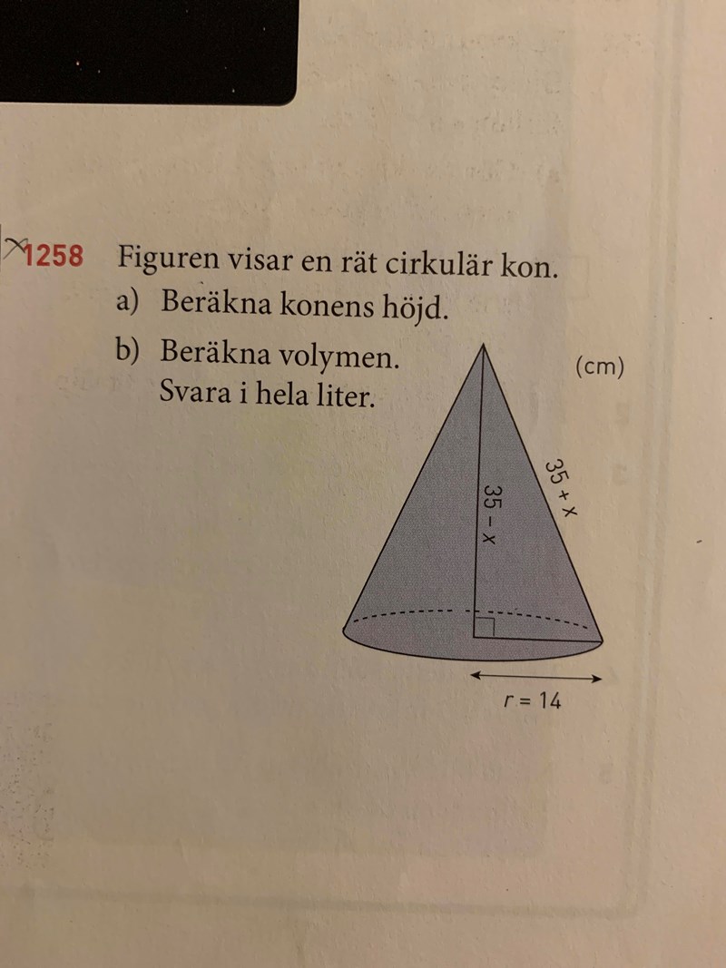 radien, höjden och 35+x skapar en rätvinklig triangel med kateterna 14 och (35-x) och hypotenusa (35+x), använd pythagoras sats för att lösa ut x och sen använd standard formeln för volym