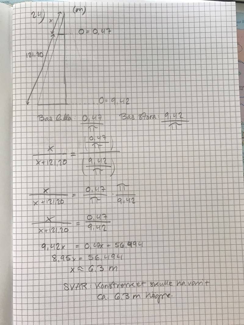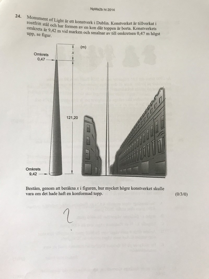 Jag har försökt räkna ut vad radien är längst ner på konen och där den ”skärs” av för att kunna räkna ut höjden, men jag fastnar. Radien längst ner får jag till ca. 1,5 m och radien där konen skärs av får jag till ca. 0,07 m. Det finns elevexempel i facit men de blir inte något vidare klokare av för de anmärks för brister och är alltså inte ideala. Hur ska jag göra?