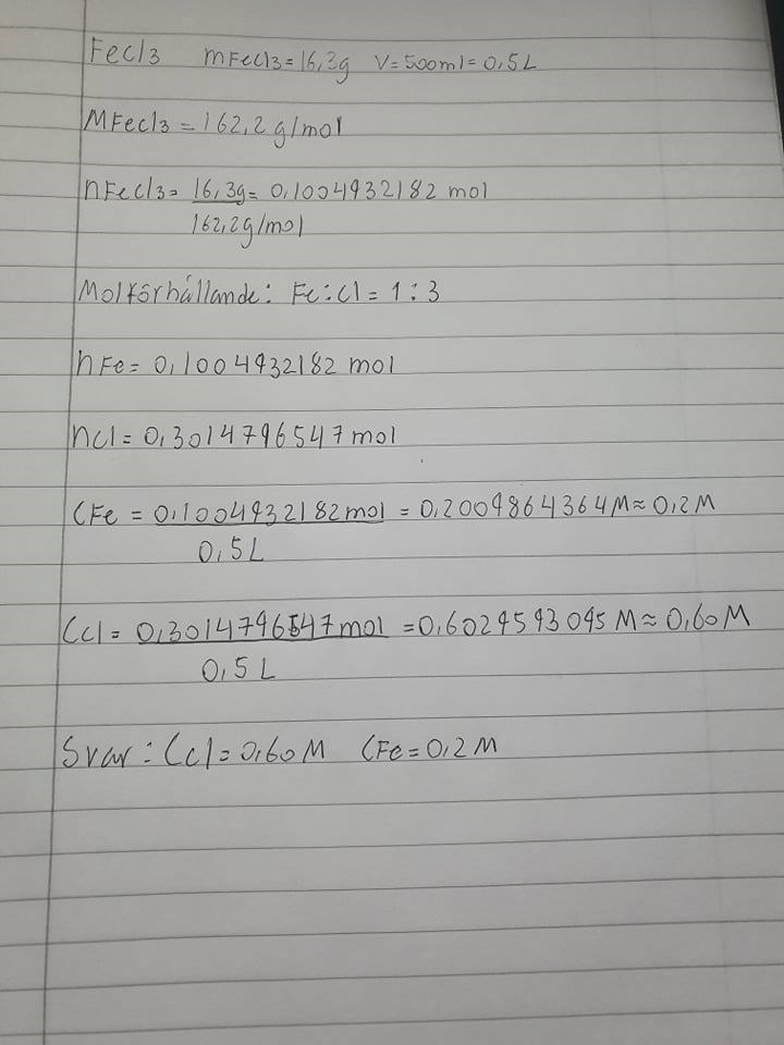 Okej jag tror jag förstår tack för din hjälp kan vi ta ett exempel till?Beräkna koncentrationerna av alla enskillda jonslag i de resulterande lösningarna för följande fall. 16.2 gram järn(III)klorid löses upp i vatten och lösning späds till 500 ml. Se bild för lösning
