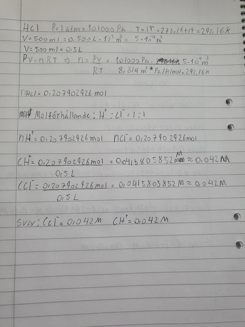 Beräkna koncentrationerna av alla enskillda jonslag i de resulterande lösningarna för följande fall. 12 L HCl-gas bubblas ner i vatten vid 1.00 atm och 19 C varefter lösningen späds till 500.0 ml. Se bild för min lösning.