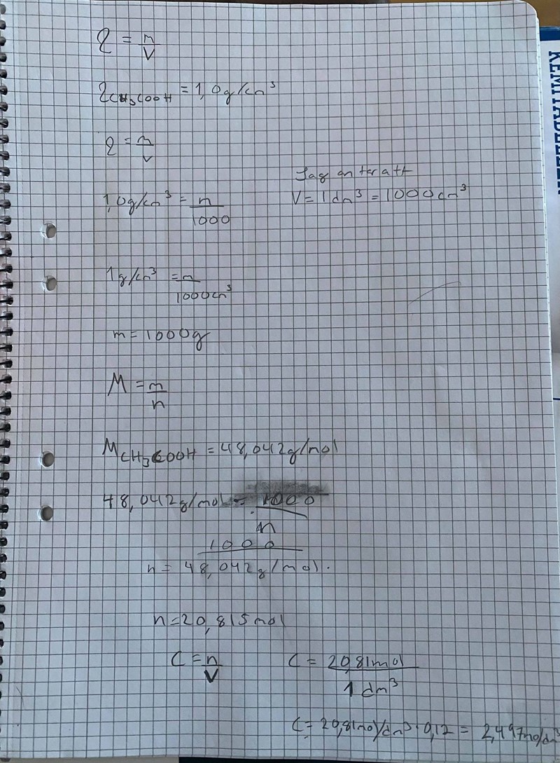 Vilken massa har 1 liter av lösningen? Hur många gram ättiksyra finns det i 1 liter ättiksprit? Hur många mol är detta?