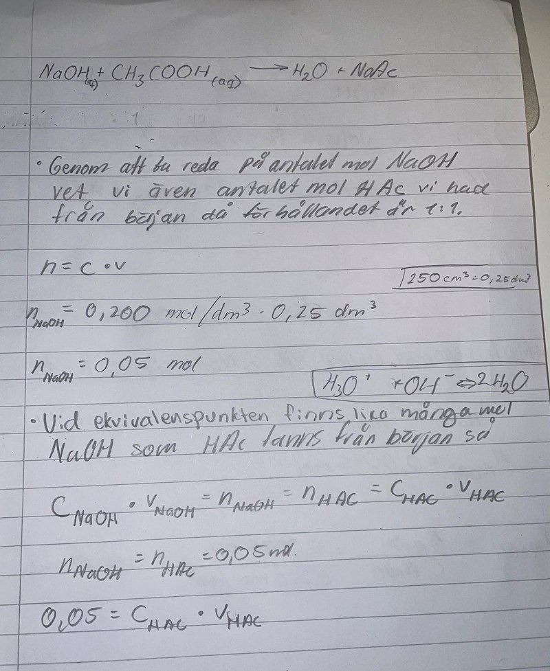 Hej, jag har fastnat på min uträkning. Det man ska göra är att bestämma halten ättiksyra i vinäger. Mina uträkningar: