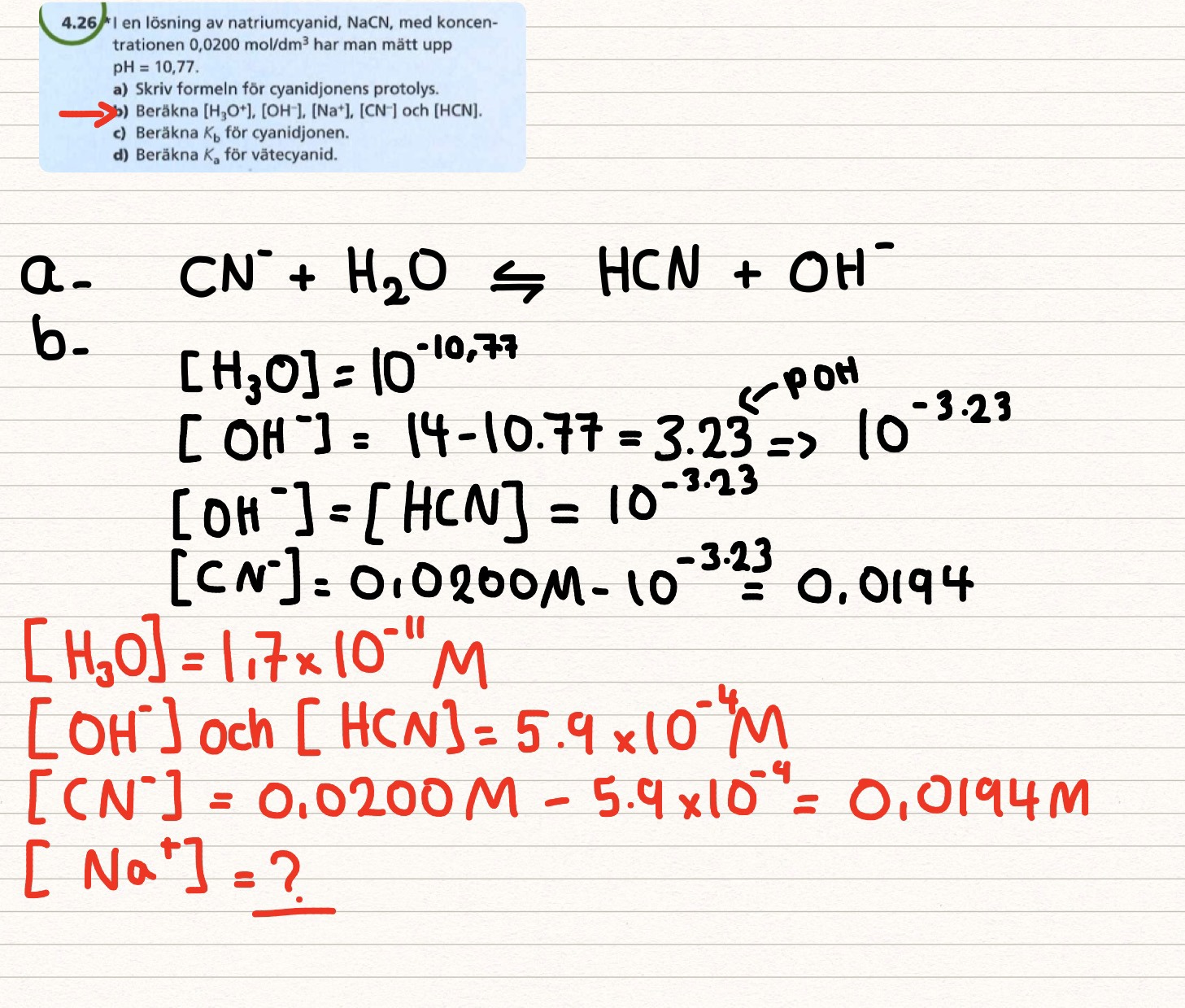Ja det ser ju rätt ut. Hur hög är koncentrationen av natriumjoner i en lösning av 0,0200 mol/dm3 natriumcyanid? Du har rätt i att det inte händer något med natriumjonerna, men de finns ändå i lösningen med en viss koncentration.